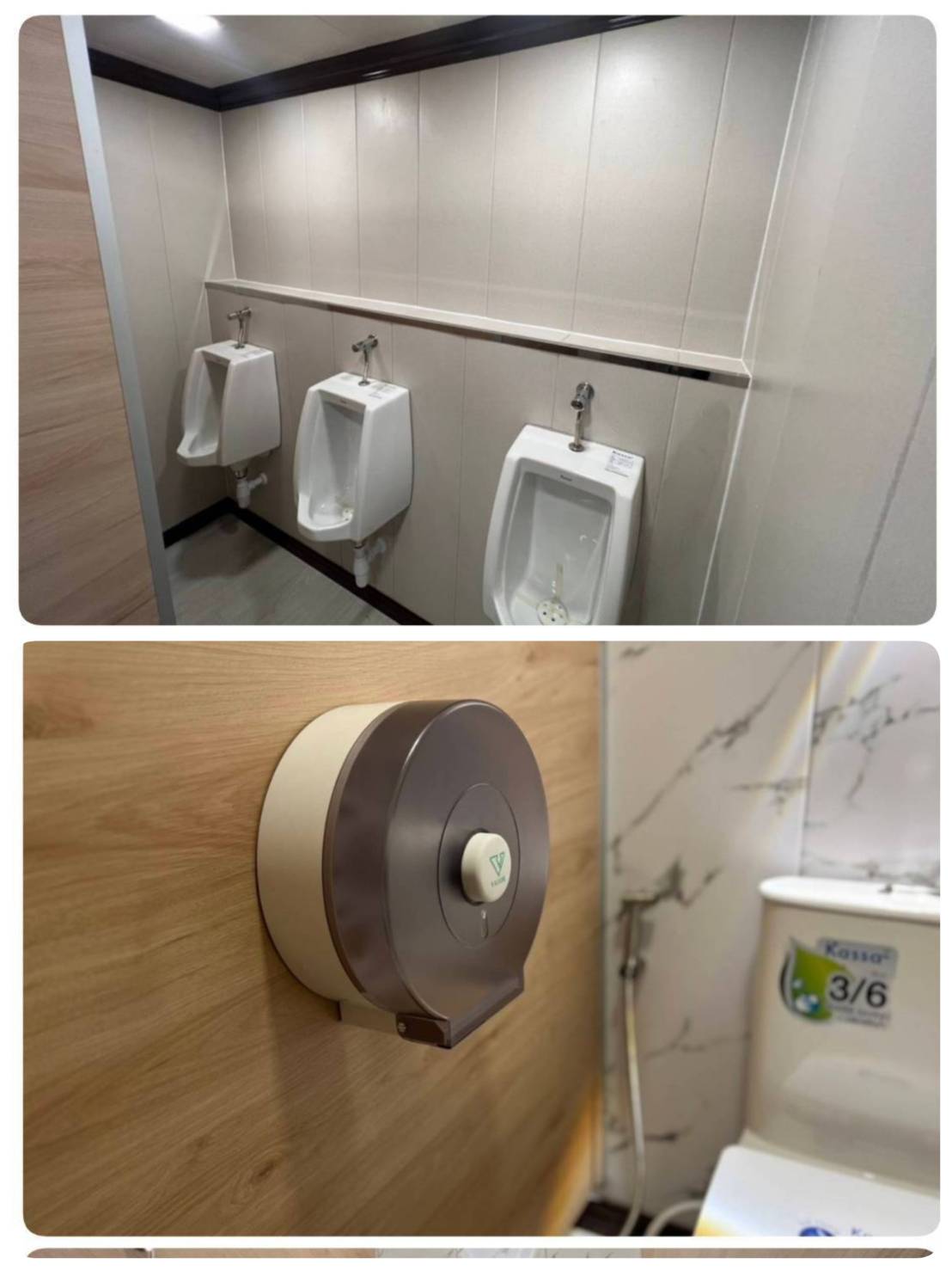 ส่วนนอก มีที่ล้างมือที่ได้รับมาตรฐาน 2 ที่ พร้อมก็อกน้ำ และกระจกเงา โถปัสสาวะชาย 2